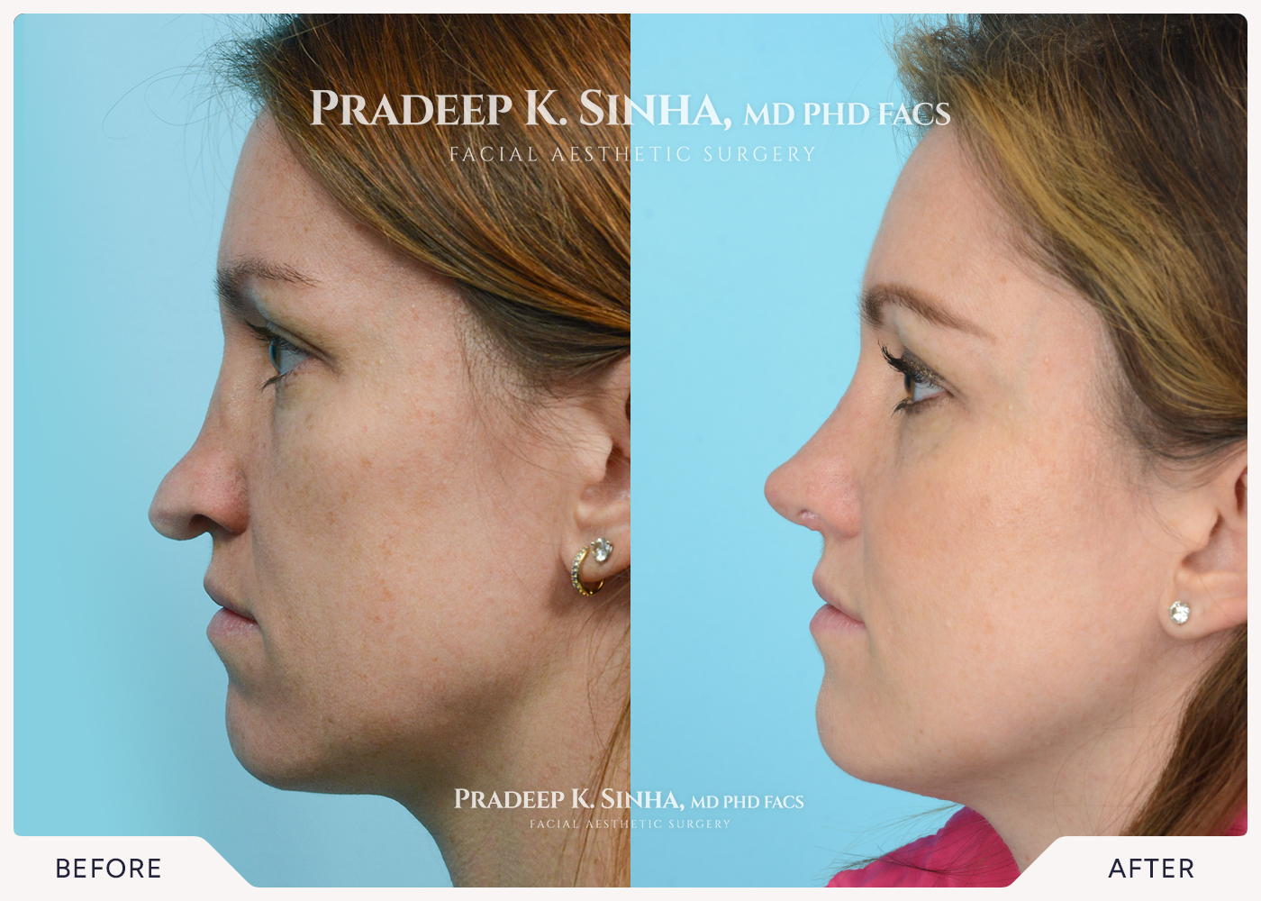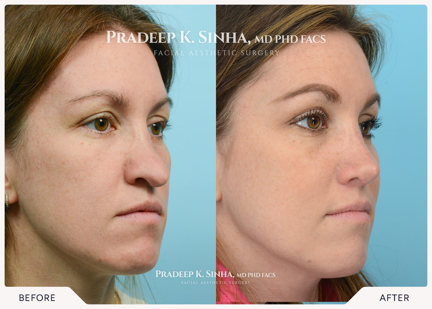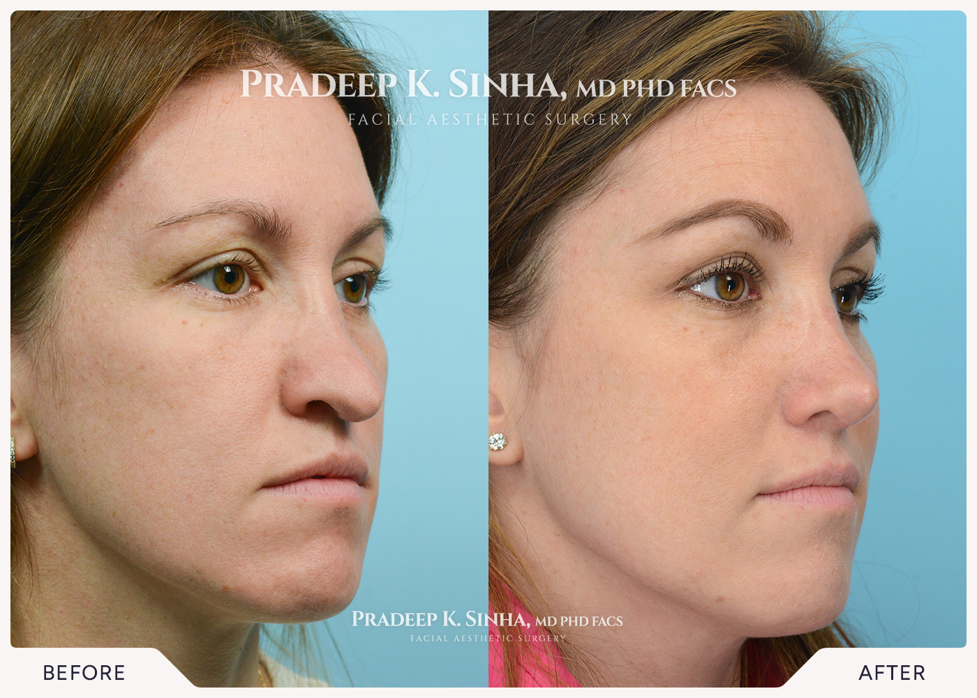 Before surgery, the nose appeared overly prominent with a large dorsal hump and a drooping nasal tip. Using advanced rhinoplasty techniques, Dr. Sinha refined the nasal bridge, lifted and reshaped the tip, and brought balance and harmony to the patient’s facial features. The outcome is a more elegant, natural-looking nose that fits the face without looking “done.”