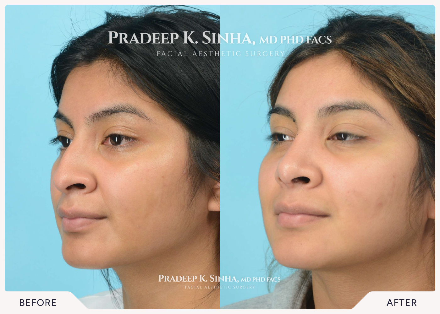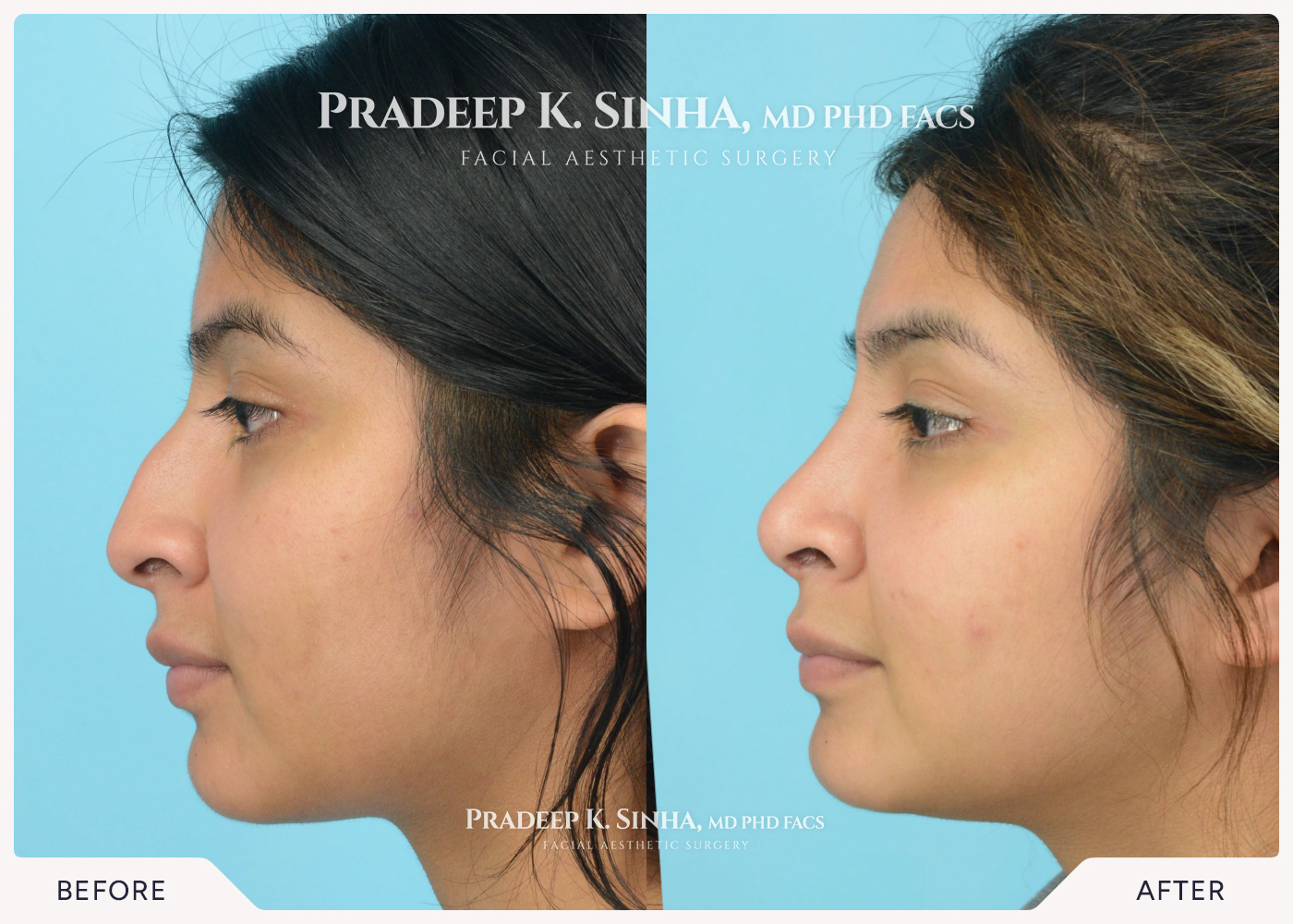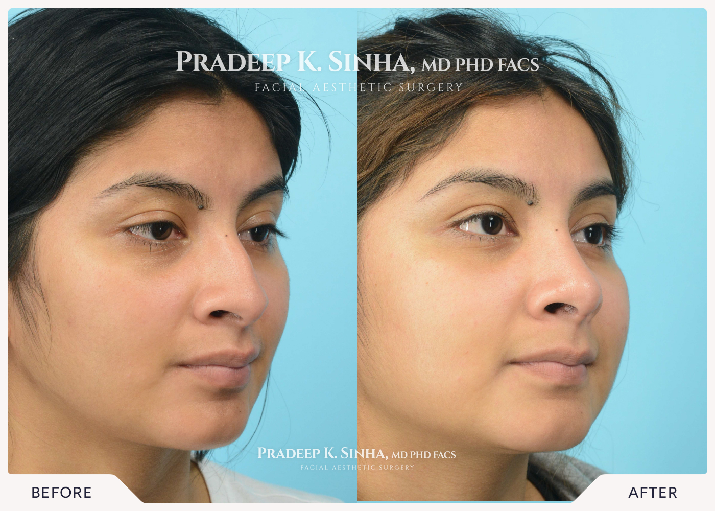 This beautiful patient came to Dr. Sinha seeking subtle, natural refinement rather than a dramatic change. As a woman of ethnic background, she wanted to preserve the unique character of her nose while achieving a more harmonious facial profile.